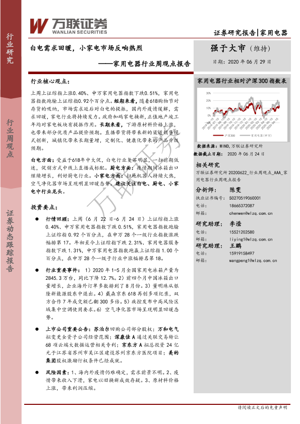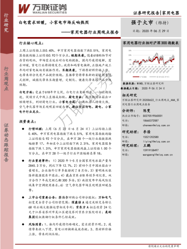 【万联证券】【20200629】20200629-万联证券-家用电器行业周观点报告:白电需求回暖,小家电市场反响热烈-9页