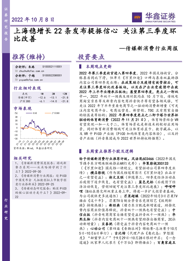 【华鑫证券】【20221008】传媒新消费行业周报:上海稳增长22条发布提振信心 关注第三季度环比改善-20页