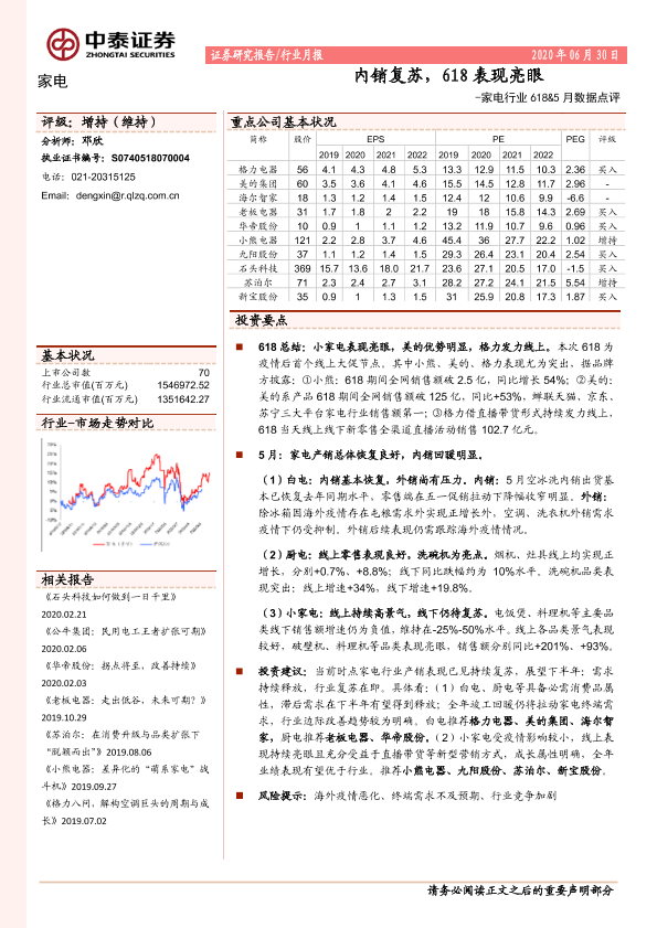 【中泰证券】【20200630】家电行业618&5月数据点评:内销复苏,618表现亮眼-12页