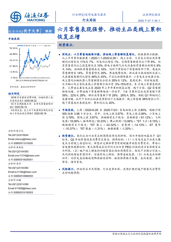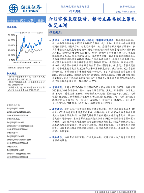 【海通证券】【20200706】20200706-海通证券-家用电器与器具行业周报:六月零售表现强势,推动主品类线上累积恢复正增-4页