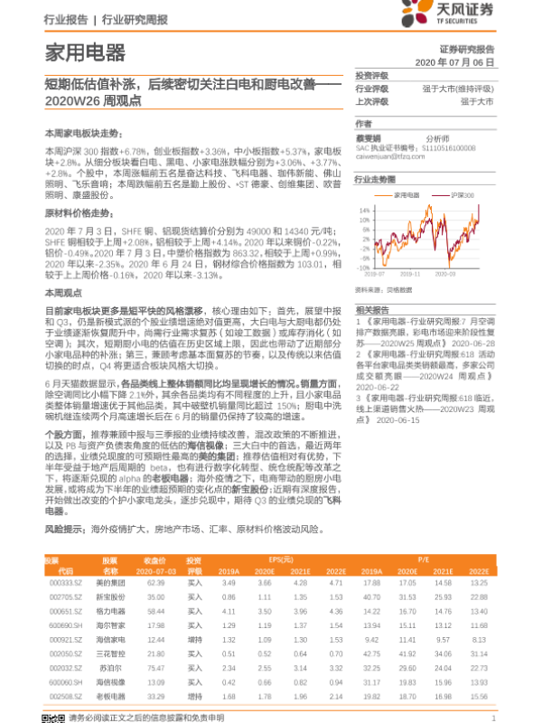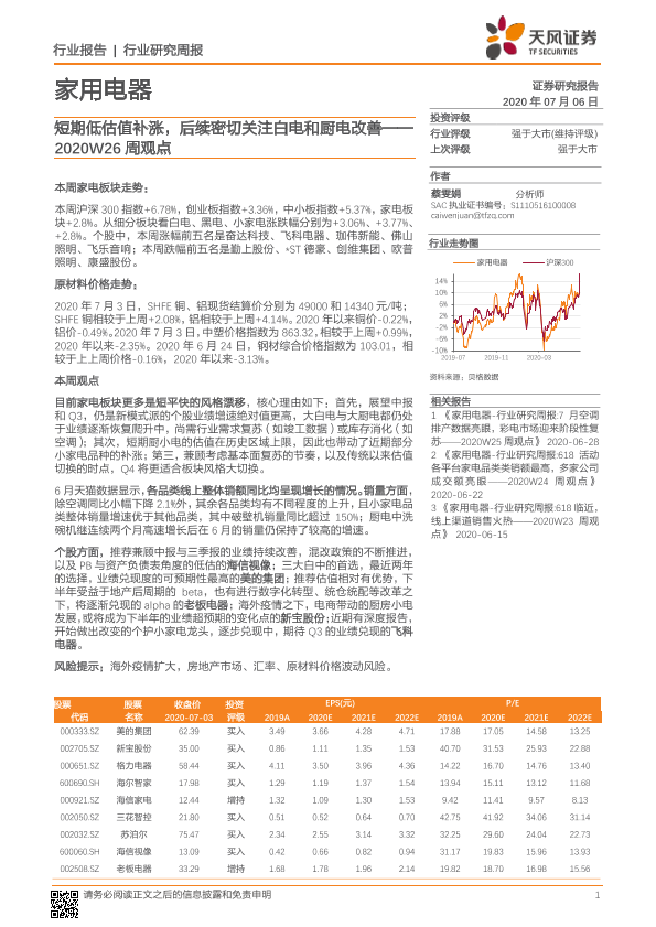 【天风证券】【20200706】家用电器2020W26周观点:短期低估值补涨,后续密切关注白电和厨电改善-16页