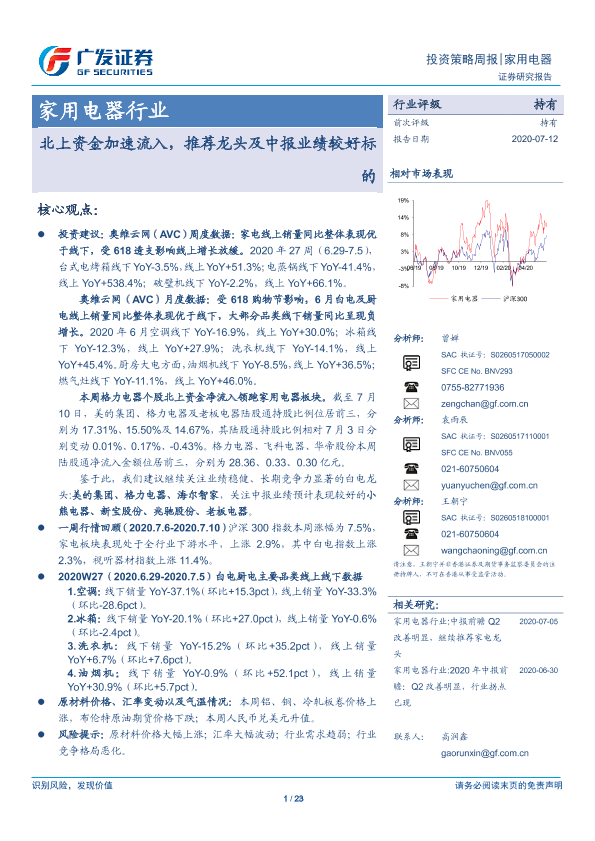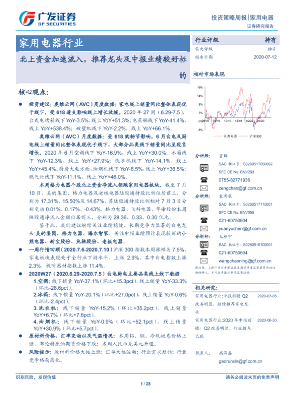 【广发证券】【20200712】家用电器行业投资策略周报:北上资金加速流入,推荐龙头及中报业绩较好标的-23页