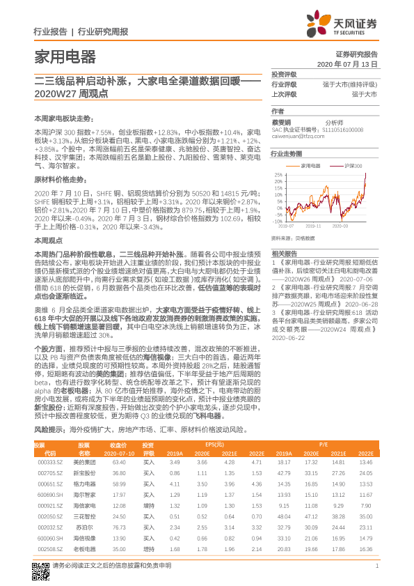 【天风证券】【20200713】家用电器2020W27周观点:二三线品种启动补涨,大家电全渠道数据回暖-16页