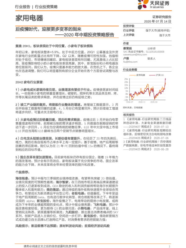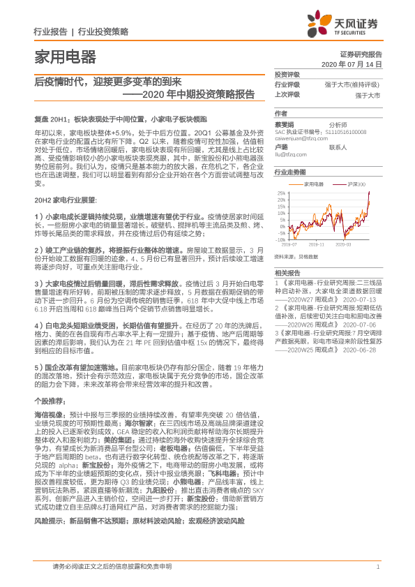 【天风证券】【20200714】20200714-天风证券-家用电器2020年中期投资策略报告:后疫情时代,迎接更多变革的到来-19页
