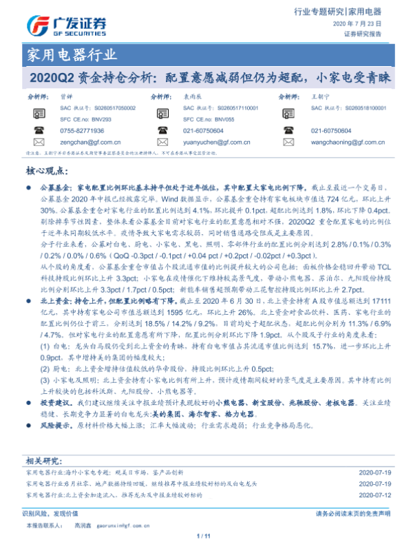 【广发证券】【20200723】2020Q2资金持仓分析:配置意愿减弱但仍为超配,小家电受青睐-11页