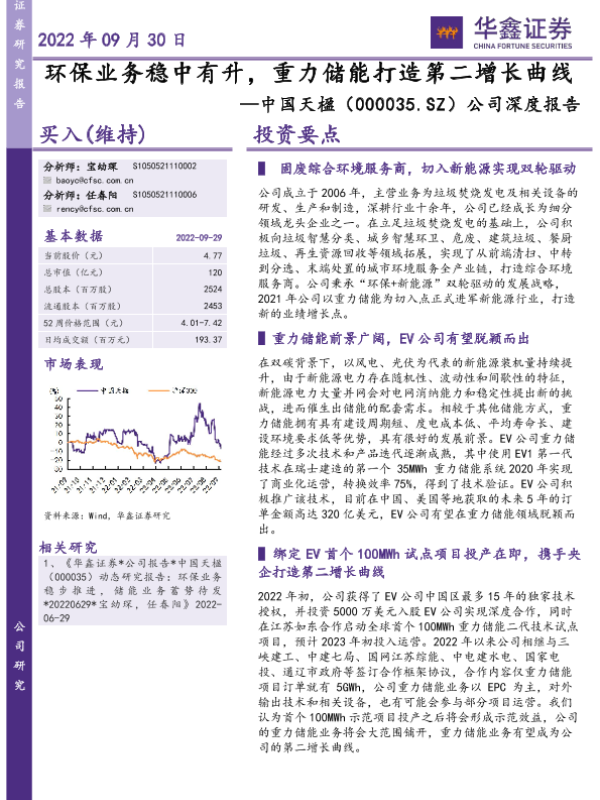 中国天楹 华鑫证券 新能源 环保业务 重力储能