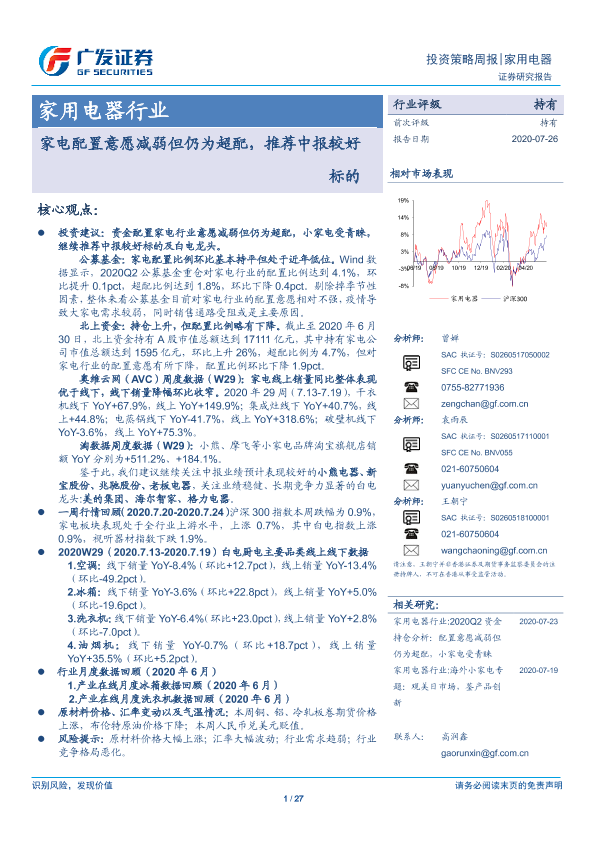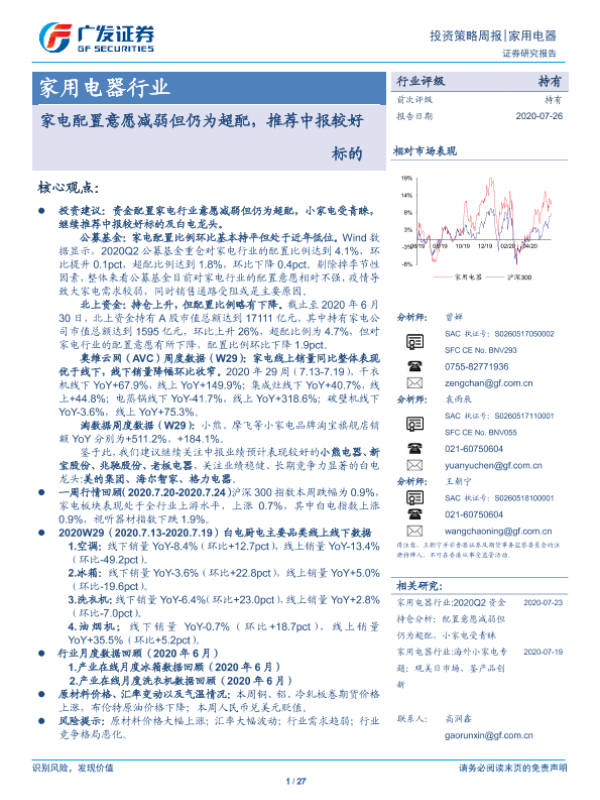 【广发证券】【20200726】家用电器行业:家电配置意愿减弱但仍为超配,推荐中报较好标的-27页