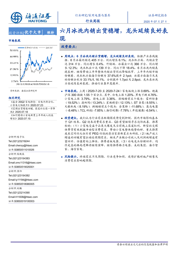 【海通证券】【20200727】家用电器与器具行业周报:六月冰洗内销出货稳增,龙头延续良好表现-4页