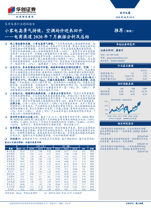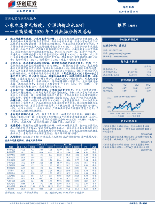 【华创证券】【20200809】家用电器行业跟踪报告 电商渠道2020年7月数据分析及总结:小家电高景气持续,空调均价迎来回升-20页