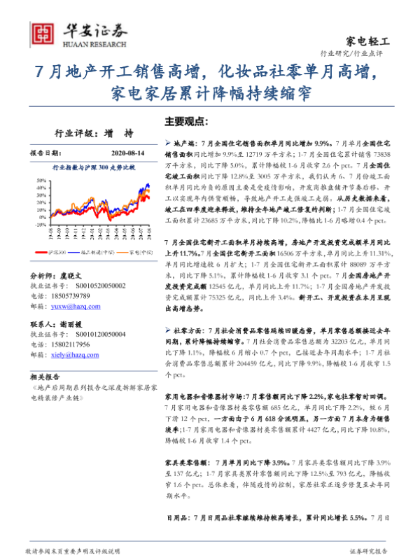 【华安证券】【20200814】家电轻工:7月地产开工销售高增,化妆品社零单月高增,家电家居累计降幅持续缩窄-11页