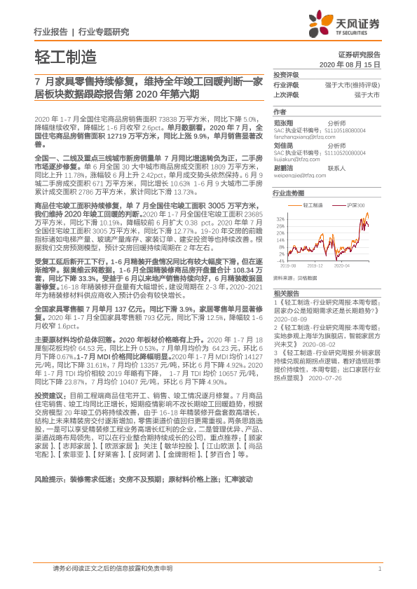 【天风证券】【20200815】20200815-天风证券-家居板块数据跟踪报告第2020年第六期:7月家具零售持续修复,维持全年竣工回暖判断-17页