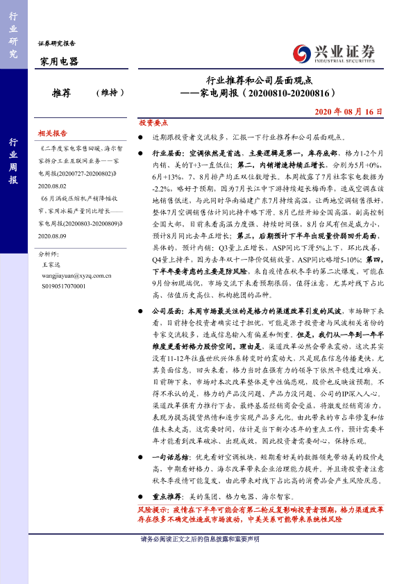 【兴业证券】【20200816】行业推荐和公司层面观点 ——家电周报(20200810-20200816)-8页