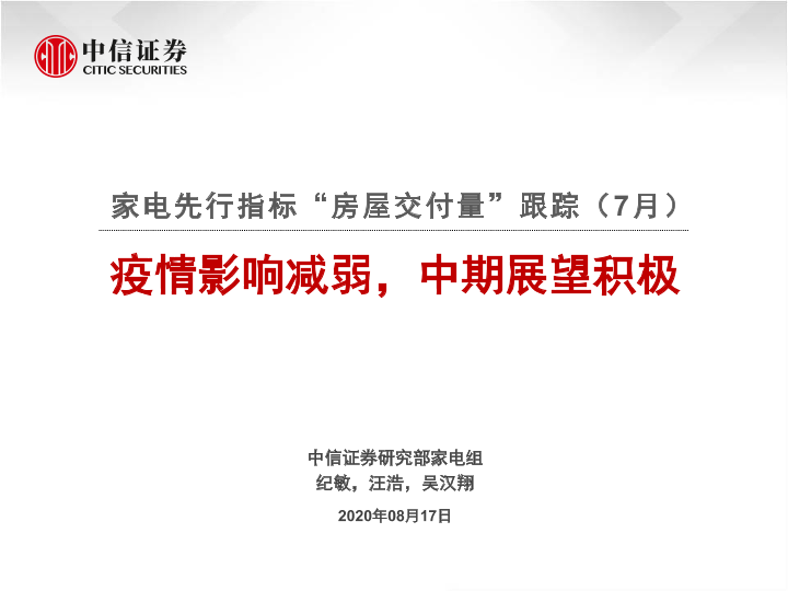 【中信证券】【20200817】家电行业先行指标“房屋交付量”跟踪(7月):疫情影响减弱,中期展望积极-9页