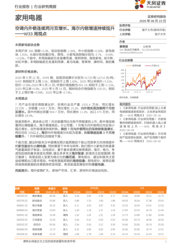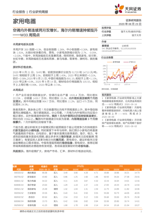 【天风证券】【20200823】家用电器W33周观点:空调内外销连续两月双增长,海尔内销增速持续提升-13页