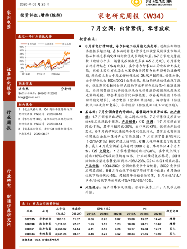 【财通证券】【20200825】20200825-财通证券-家电研究周报(W34):7月空调:出货紧俏,零售疲软-20页