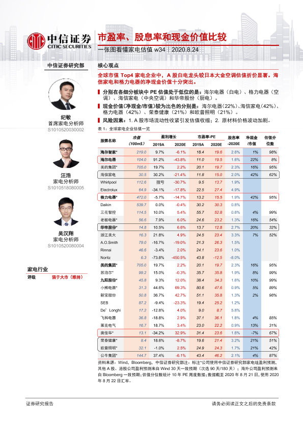 【中信证券】【20200824】一张图看懂家电估值w34:市盈率、股息率和现金价值比较-2页
