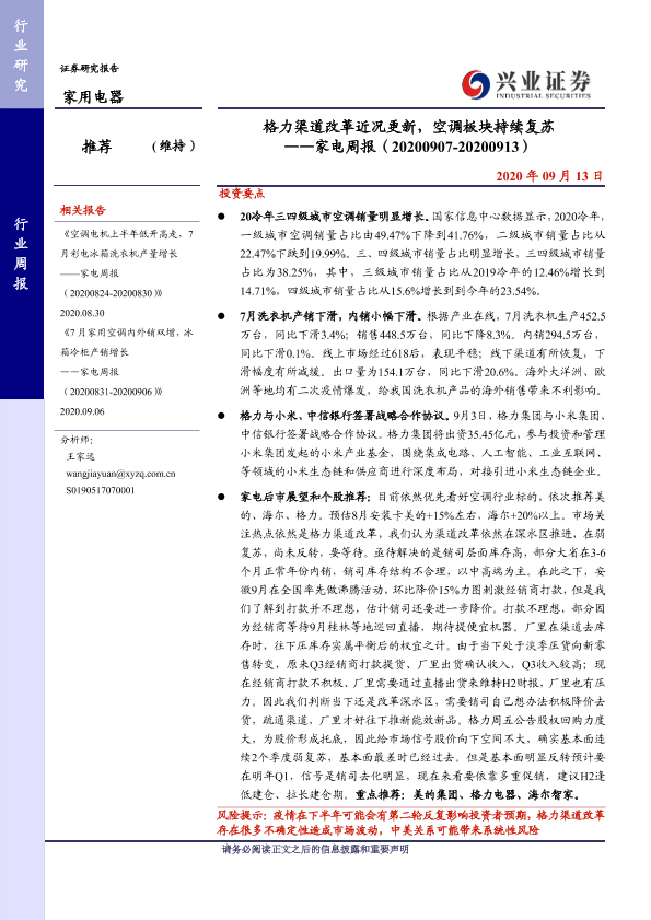 【兴业证券】【20200913】格力渠道改革近况更新,空调板块持续复苏 ——家电周报(20200907-20200913)-8页