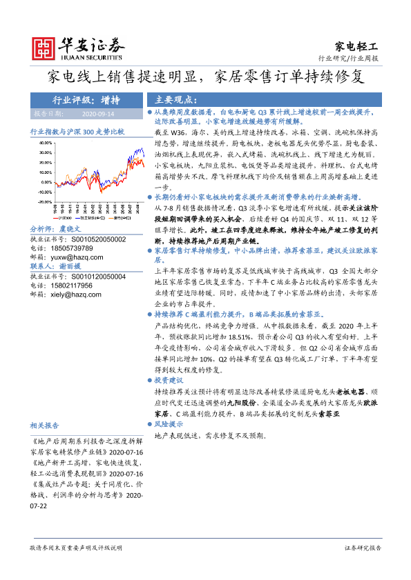 【华安证券】【20200914】家电轻工行业周报:家电线上销售提速明显,家居零售订单持续修复-18页
