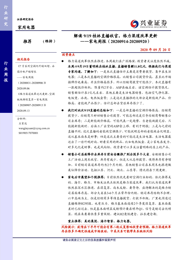 【兴业证券】【20200920】解读9/19桂林直播收官,格力渠道改革更新 ——家电周报(20200914-20200920)-8页