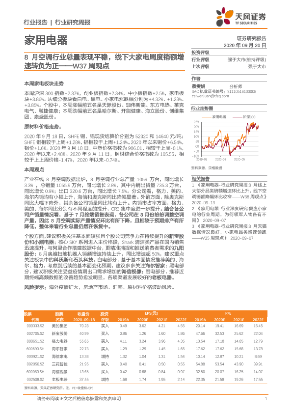 【天风证券】【20200920】家用电器W37周观点:8月空调行业总量表现平稳,线下大家电周度销额增速转负为正-13页