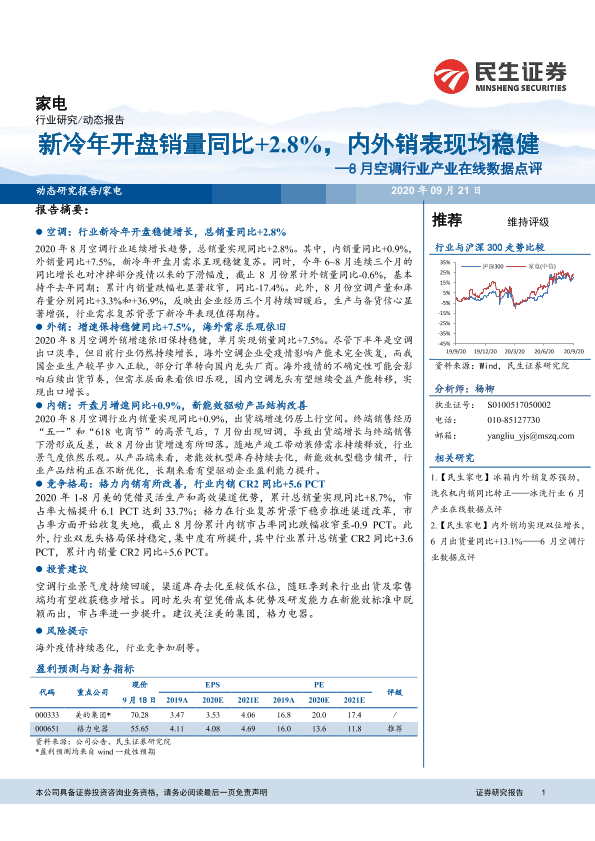 【民生证券】【20200921】20200921-民生证券-家电动态报告:8月空调行业产业在线数据点评-新冷年开盘销量同比+2.8%,内外销表现均稳健-9页