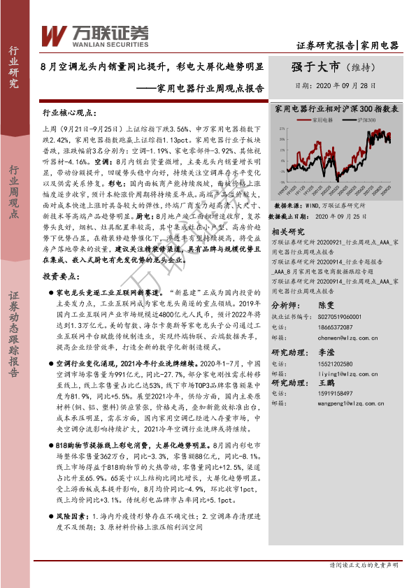 【万联证券】【20200928】20200928-万联证券-家用电器行业周观点报告:8月空调龙头内销量同比提升,彩电大屏化趋势明显-13页