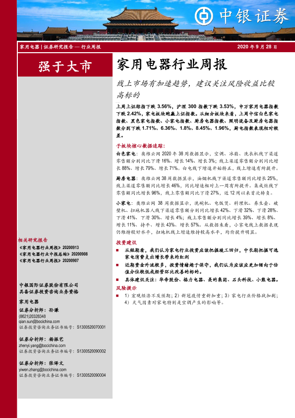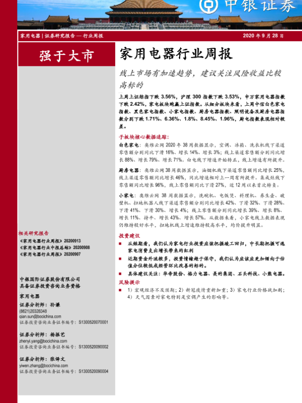 【中银证券】【20200928】家用电器行业周报:线上市场有加速趋势,建议关注风险收益比较高标的-27页