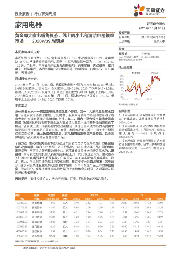 【天风证券】【20201008】家用电器2020W39周观点:黄金周大家电销售复苏,线上厨小电和清洁电器领跑市场-14页