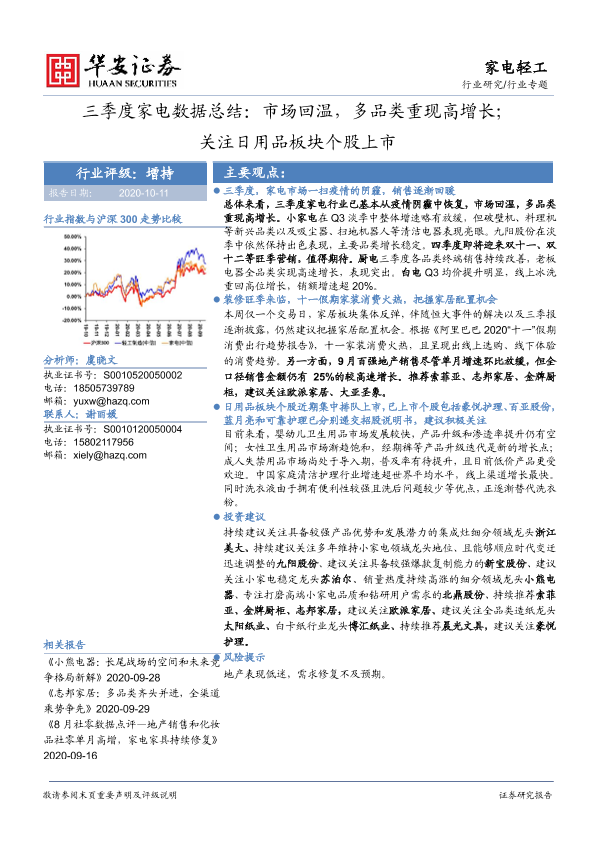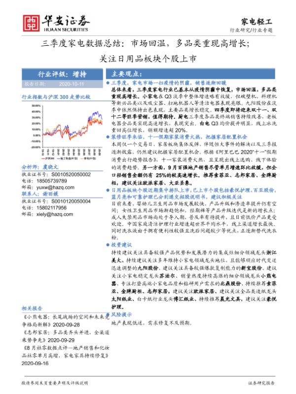 【华安证券】【20201011】三季度家电数据总结:市场回温,多品类重现高增长;关注日用品板块个股上市-28页