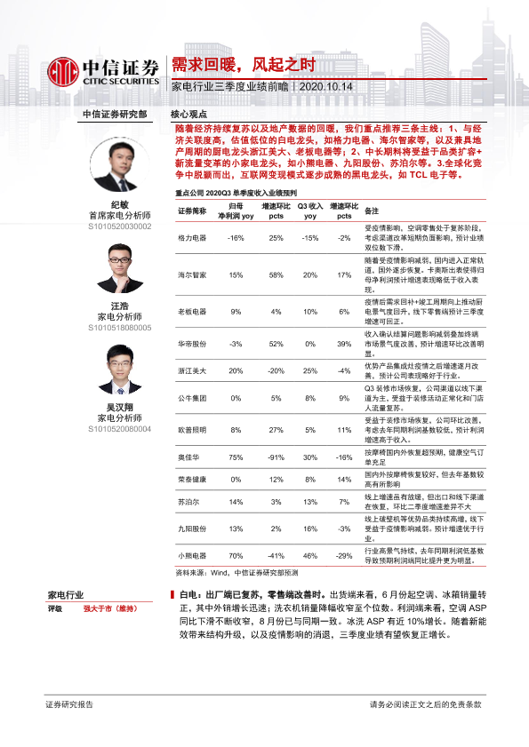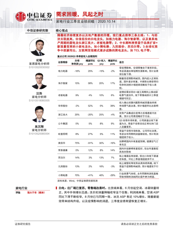 【中信证券】【20201014】家电行业三季度业绩前瞻:需求回暖,风起之时-3页