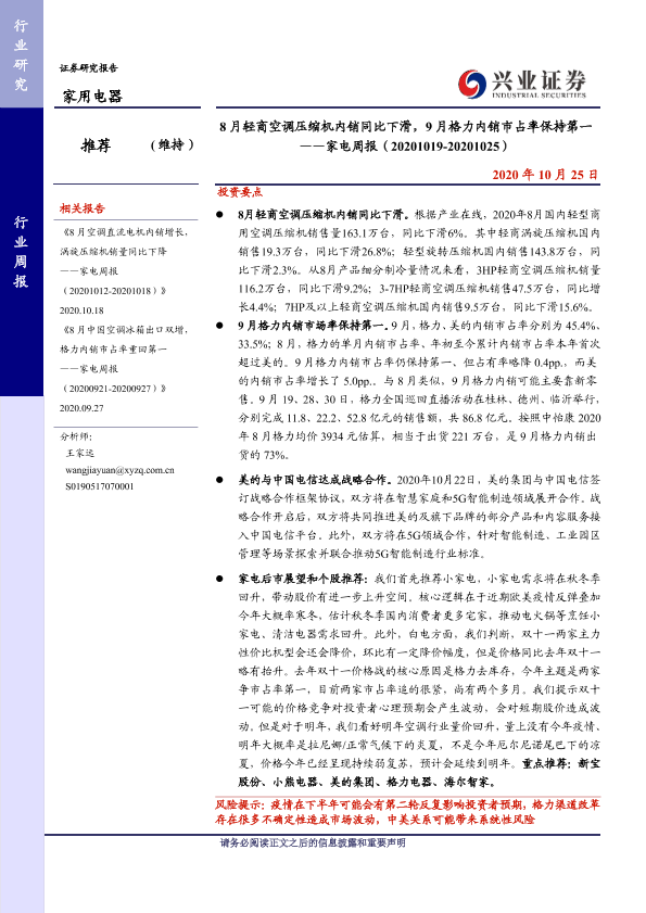 【兴业证券】【20201025】8月轻商空调压缩机内销同比下滑,9月格力内销市占率保持第一 ——家电周报(20201019-20201025)-8页