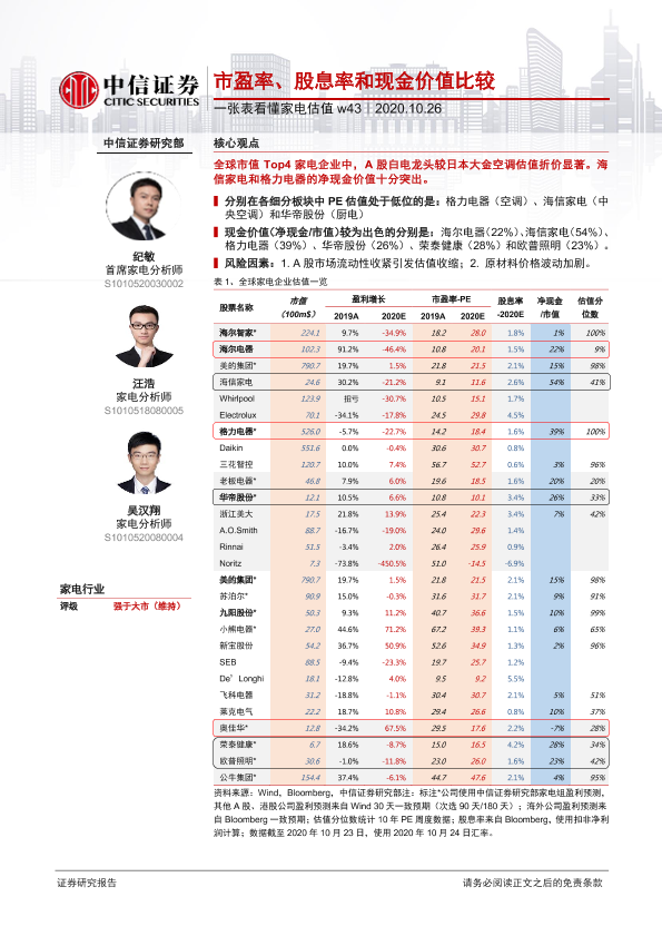 【中信证券】【20201026】一张表看懂家电估值w43:市盈率、股息率和现金价值比较-2页