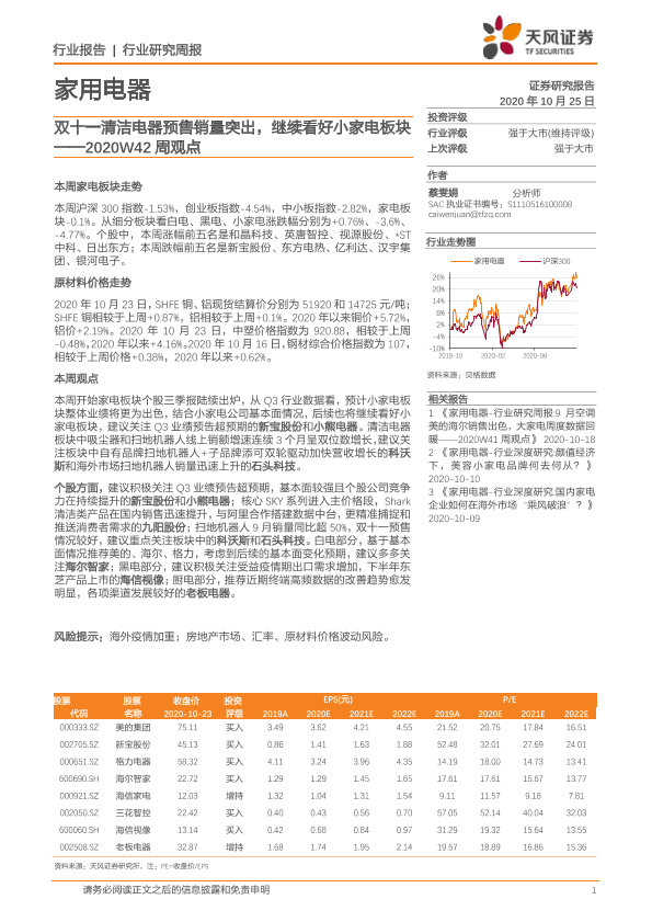 【天风证券】【20201025】家用电器2020W42周观点:双十一清洁电器预售销量突出,继续看好小家电板块-14页