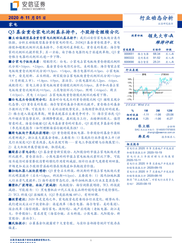 【安信证券】【20201101】20201101-安信证券-家电行业动态分析:Q3基金重仓家电比例基本持平,个股持仓继续分化-11页