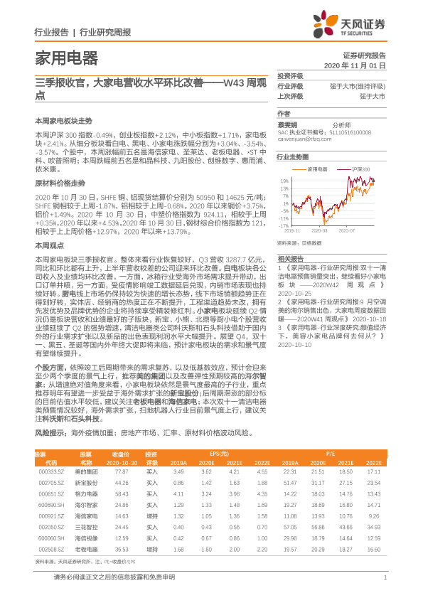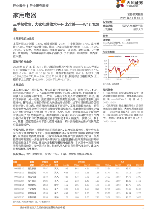 【天风证券】【20201101】家用电器W43周观点:三季报收官,大家电营收水平环比改善-15页