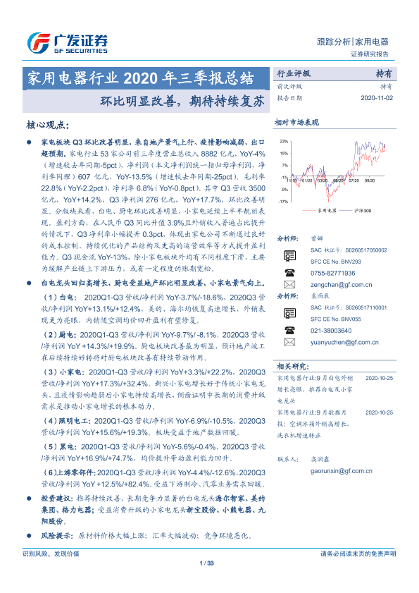 【广发证券】【20201102】家用电器行业2020年三季报总结:环比明显改善,期待持续复苏-33页