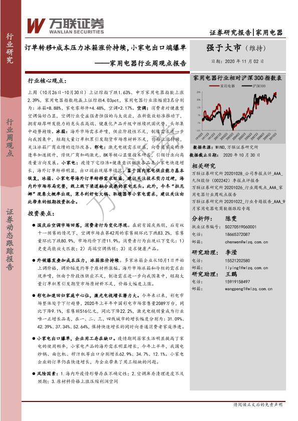【万联证券】【20201102】20201102-万联证券-家用电器行业周观点报告:订单转移+成本压力冰箱涨价持续,小家电出口端爆单-16页
