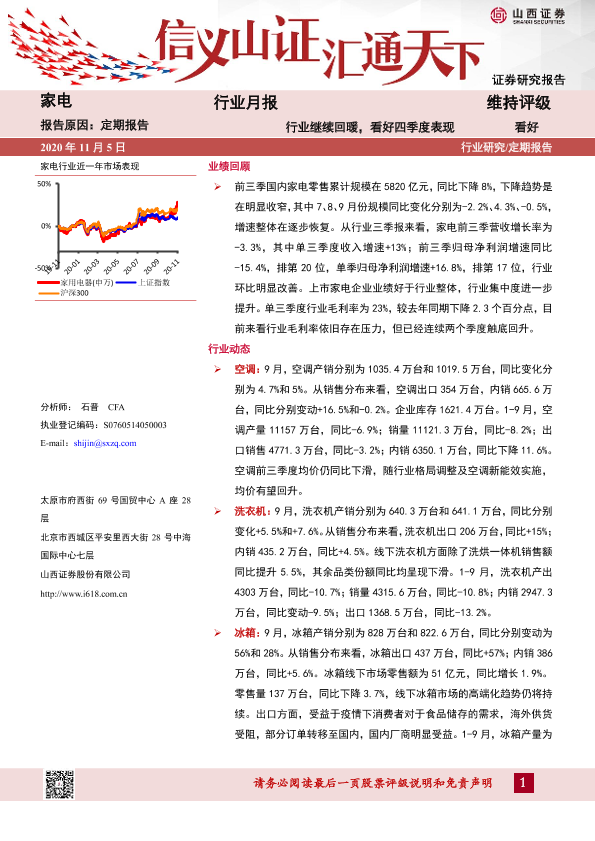 【山西证券】【20201105】家电行业月报:行业继续回暖,看好四季度表现-15页