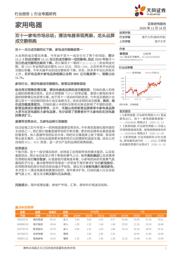 【天风证券】【20201116】家用电器双十一家电市场总结:清洁电器表现亮眼,龙头品牌成交额领跑-8页
