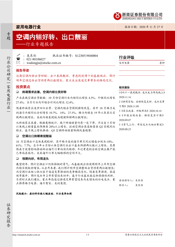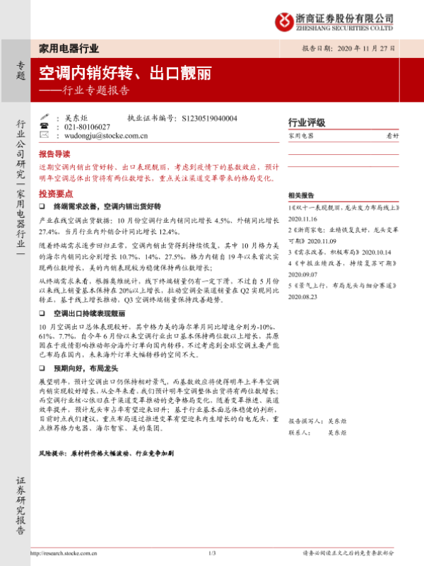 【浙商证券】【20201127】家用电器行业专题报告:空调内销好转、出口靓丽-3页