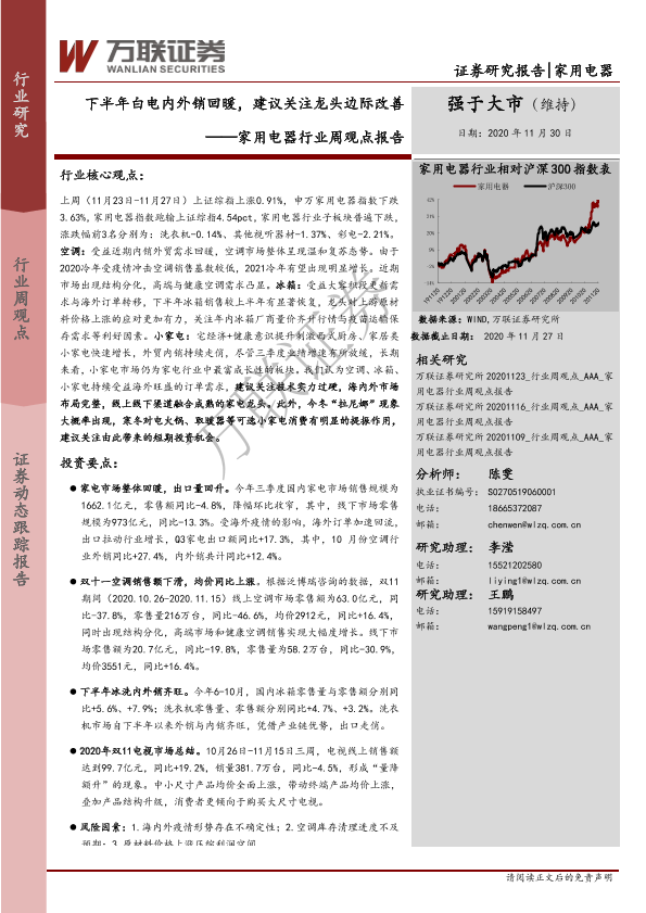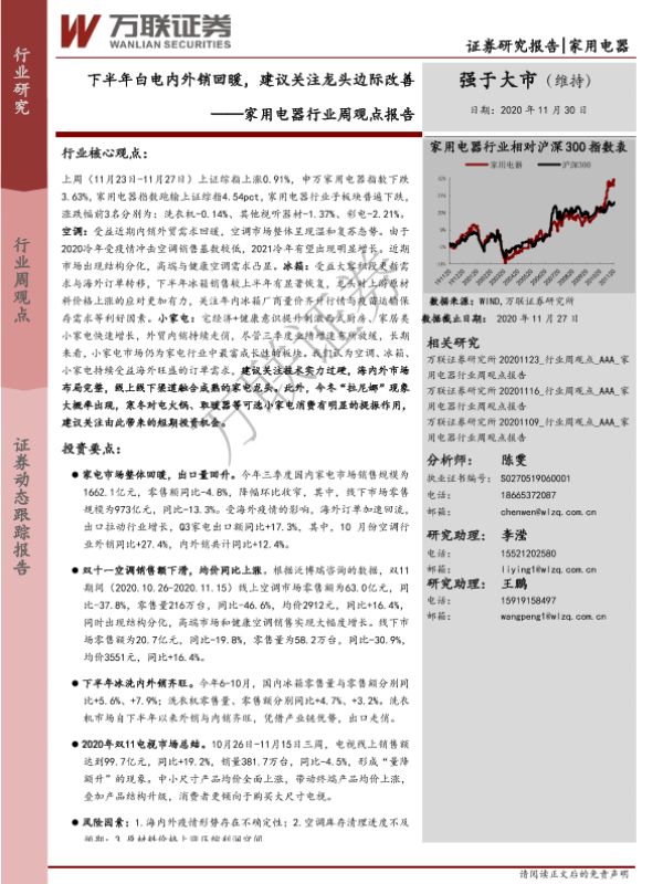 【万联证券】【20201130】20201130-万联证券-家用电器行业周观点报告:下半年白电内外销回暖,建议关注龙头边际改善-12页
