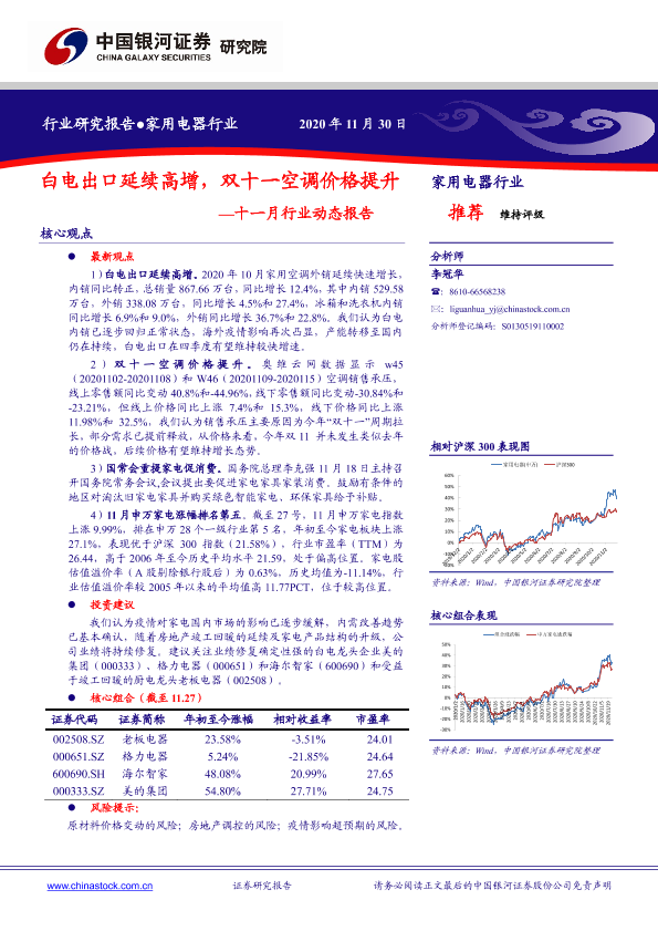 【银河证券】【20201130】家用电器行业十一月行业动态报告:白电出口延续高增,双十一空调价格提升-27页
