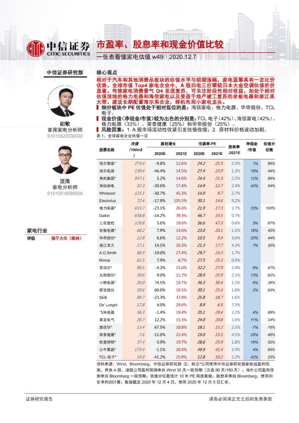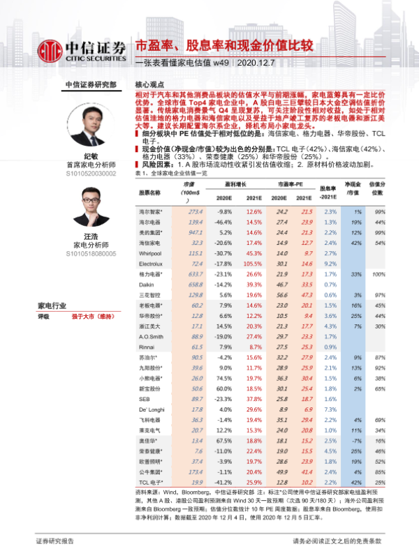 【中信证券】【20201207】20201207-中信证券-一张表看懂家电估值w49:市盈率、股息率和现金价值比较-2页