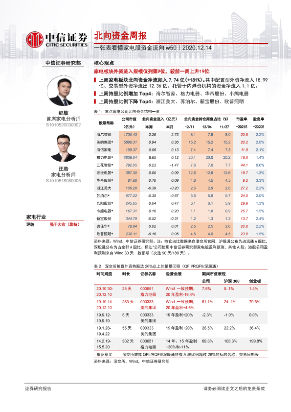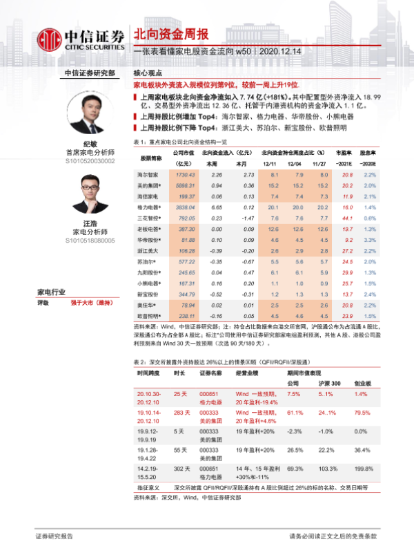 【中信证券】【20201214】家电行业北向资金周报:一张表看懂家电股资金流向w50-2页