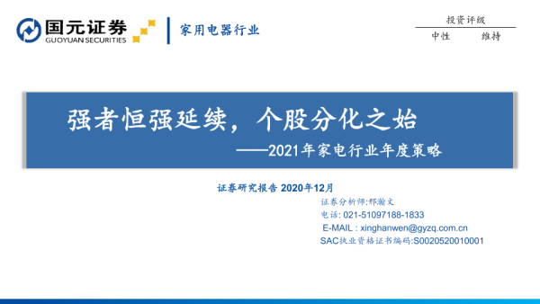 【国元证券】【202012】2021年家电行业年度策略:强者恒强延续,个股分化之始-29页