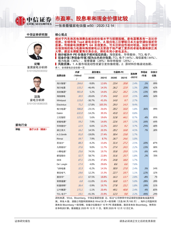 【中信证券】【20201214】一张表看懂家电估值w50:市盈率、股息率和现金价值比较-2页
