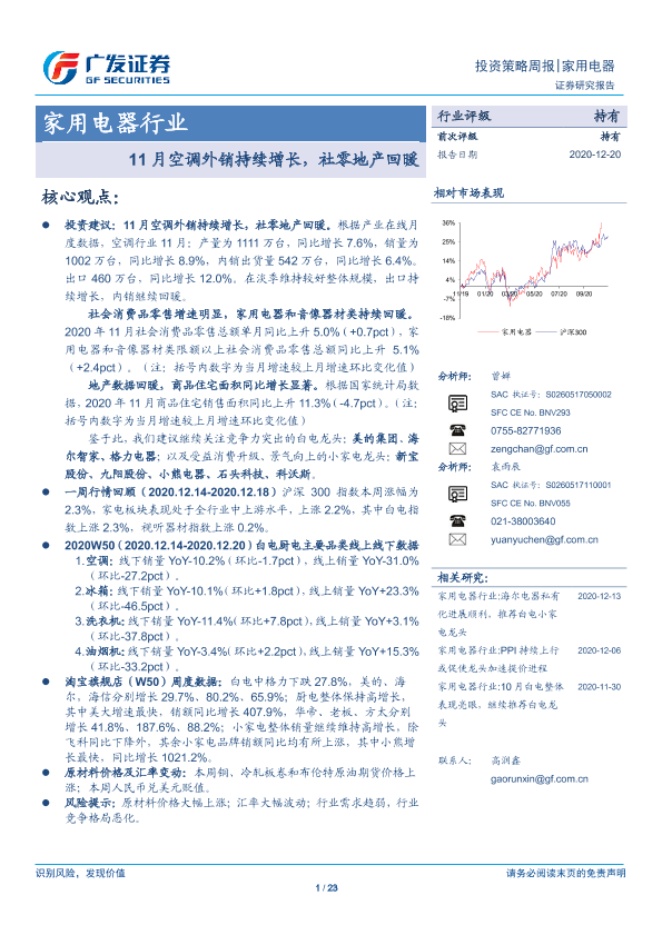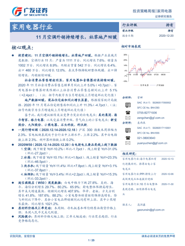 【广发证券】【20201220】20201220-广发证券-家用电器行业投资策略周报:11月空调外销持续增长,社零地产回暖-23页