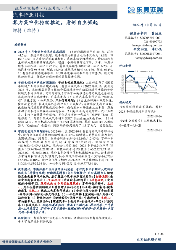 【东吴证券】【20221007】汽车行业月报:算力集中化持续推进,看好自主崛起-24页