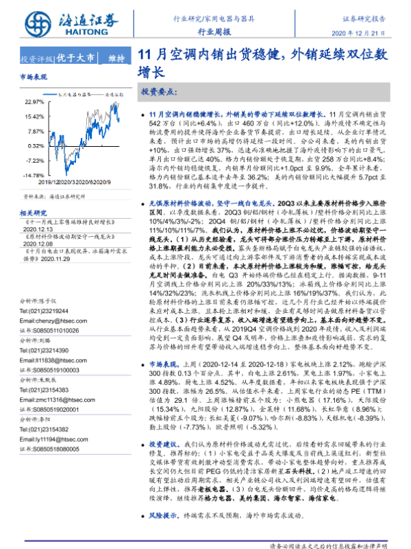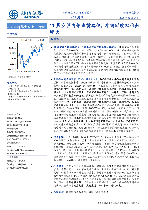 【海通证券】【20201221】家用电器与器具行业周报:11月空调内销出货稳健,外销延续双位数增长-5页