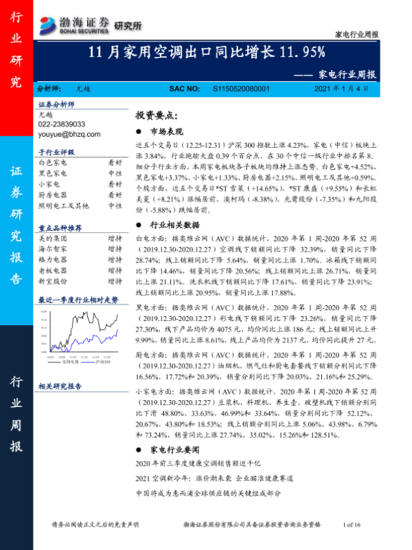 【渤海证券】【20210104】家电行业周报:11月家用空调出口同比增长11.95%-16页